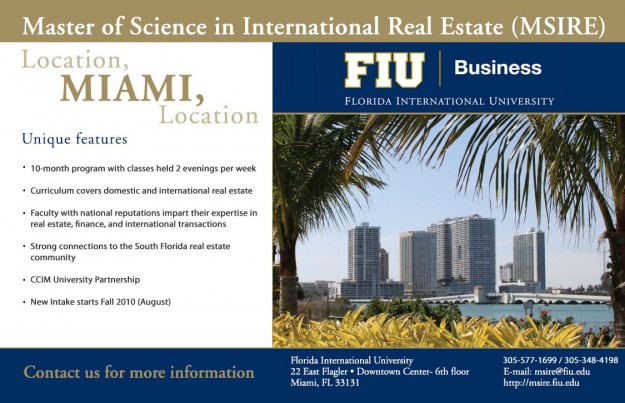 Join Ed Redlich and other leaders of Miami’s commercial real estate organizations on April 13th, 2010 at 7:45 PM at Florida International University’s main campus located at 11200 SW 8th Street, Miami, Florida 33199 in the MARC Pavilion. Hosted by FIU Real Estate Student Association (FIU RESA). Each speaker will present the commercial real estate…